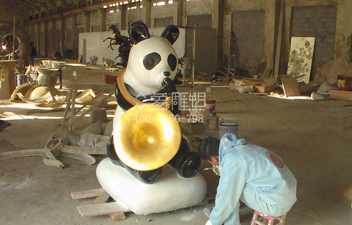 這組音樂題材的雕塑共三個雕塑,一位正在演奏的小提琴家,一位翩翩起舞的芭蕾舞女,和一只吹喇叭的大熊貓,其中小提琴家和芭蕾舞女雕塑 為真人大小,大熊貓雕塑高度為160CM,材質為玻璃鋼,工藝為噴漆彩繪。