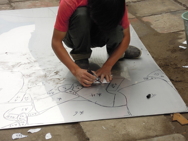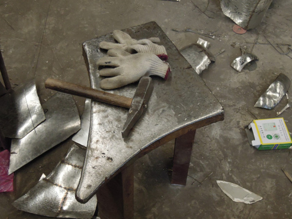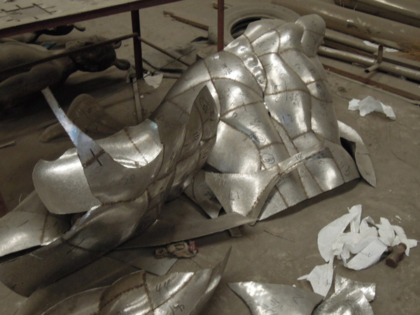 用玻璃鋼制作的模型強度會比較好,不用擔心像泥塑的模型那樣容易碰壞。采用冷作加工的方式時,工人們會將整個雕塑的外表面分割成很多個小塊,并且會對每個塊進行編號。用于不銹鋼冷作加工的原材料是事先做好的不同厚度的不銹鋼板,工人們需要在不銹鋼板上根據編好號的每一個小區域,畫出與之對應的形狀。由于不銹鋼板是平面的,而雕塑作品的表面是立體的,所以一是每個小塊的面積不能太大,另外每個小塊也需要留有一定的余地來方便之后的加工。